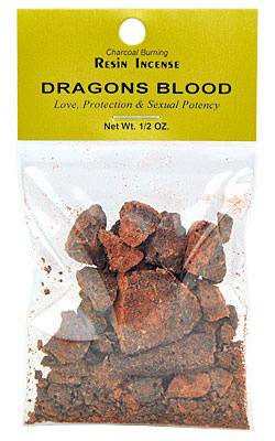 Dragons blood resin incense has a sensual, earthy warmth. It smells sweet and soft, slightly amber-like but more natural and less sticky/sweet smelling than common amber. An ancient incense used for love, protection and to exorcise negative energies. The name dragons blood is due to the bright red colour of the resin. The resin is not usually extracted from just one tree but a specific tree species. These come from the plant groups Pterocarpus, Daemonorops, and Dracaena.