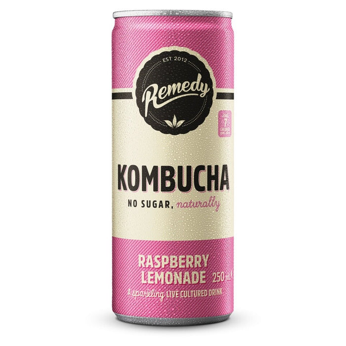Raw Kombucha (Carbonated Water, Sugar*, Black Tea Leaves, Green Tea Leaves, Traditional Kombucha Culture), Flavour Enhancer: Erythritol, Hibiscus Tea, Natural Raspberry Flavouring, Lemon Juice, Sweetener: Steviol Glycosides, *No Sugar remains after Remedy's traditional long-aged fermentation