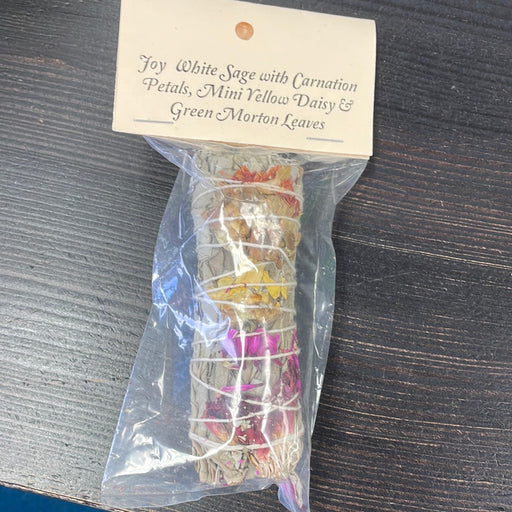 Joy White Sage Incense Wand with Carnation Petals, Mini Yellow Daisy & Green Morton Leaves 4"wand