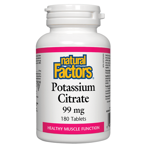 Natural Factors Potassium Citrate tablets contain 99 mg of Potassium. Potassium maintains healthy nerves and muscles in conjunction with calcium. I...