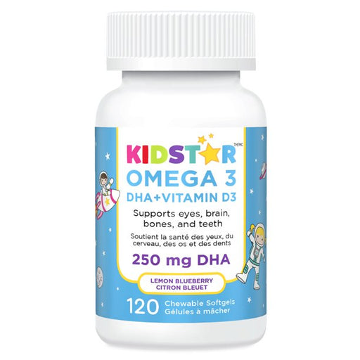 A high-DHA formula with added vitamin D3 in a yummy lemon blueberry chewable softgels. KidStar Omega 3 DHA + Vitamin D3 supports eyes, brain, bones...