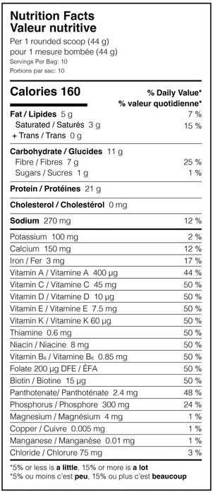 Protein blend (pea protein, milled golden flaxseed), Natural flavours, Soluble tapioca fibers, Coconut milk powder* (coconut milk powder*, tapioca maltodextrin*, acacia gum*), Medium chain triglycerides (medium chain triglycerides from coconut oil, tapioca maltodextrin), Acacia gum, Guar gum, Xanthan gum, Beetroot colour, Fruits, vegetables and mushrooms blend (spinach, broccoli, carrot, sweet potato, orange, apple, strawberry, sunflower seeds, shiitake mushroom, maitake mushroom, pomegranate juice powder*, acai juice powder*, goji juice powder*, grape juice powder*, amla fruit powder*, cranberry powder*, aronia powder*, sea buckthorn juice powder*, camu camu powder*, acerola juice powder*), Rebaudioside M, Salt, Citric acid, Bacterial culture and enzymes blend (rice maltodextrin, Bacillus subtilis, bromelain, papain). *Organic ingredients