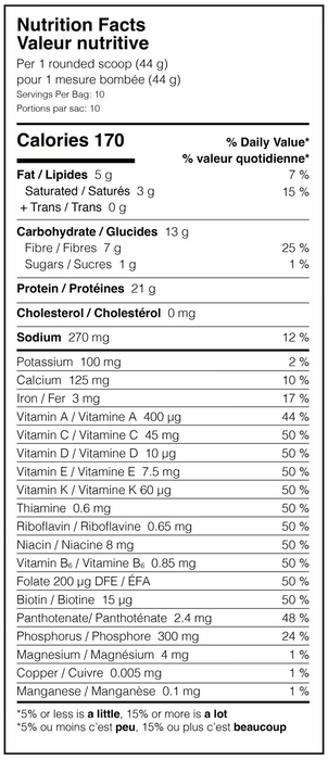 Protein blend (pea protein, milled golden flaxseed), Natural flavours, Soluble tapioca fibers, Coconut milk powder* (coconut milk powder*, tapioca maltodextrin*, acacia gum*), Medium chain triglycerides (medium chain triglycerides from coconut oil, tapioca maltodextrin), Acacia gum, Guar gum, Xanthan gum, Fruits, vegetables and mushrooms blend (spinach, broccoli, carrot, sweet potato, orange, apple, strawberry, sunflower seed, shiitake mushroom, maitake mushroom, pomegranate juice powder*, acai juice powder*, goji juice powder*, grape juice powder*, amla fruit powder*, cranberry powder*, aronia powder*, sea buckthorn juice powder*, camu camu powder*, acerola juice powder*), Rebaudioside M, Salt, Bacterial culture and enzymes blend (rice maltodextrin, Bacillus subtilis, bromelain, papain). *Organic ingredients