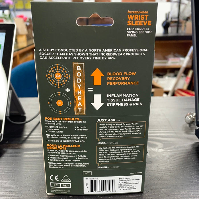 The Incrediwear Wrist Sleeve is designed to help alleviate joint pain, reduce swelling, and resist muscle fatigue. The Wrist Sleeve helps increase circulation, which promotes accelerated healing and resistance to injury. It can be used to help with carpel tunnel syndrome, arthritis, sprins and cold hands.