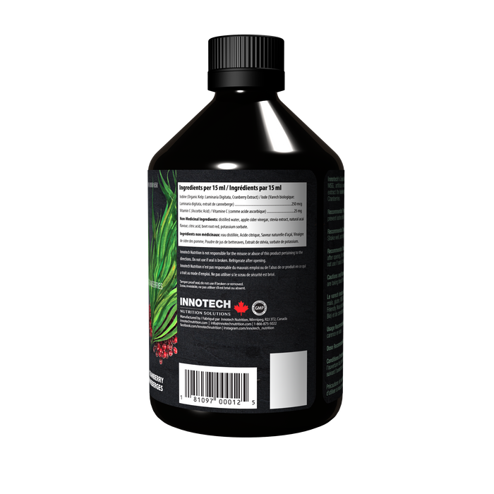 Innotech Nutrition has developed a whole food Liquid Kelp™ complete with naturally sun-fed Cranberry juice powder and Organic Kelp from the order Lamanaria Digitata. It is a variety of kelp that grows prolifically in the subtidal waters of the North Atlantic. Digitata Kelp tends to contain higher amounts of iodine, calcium, potassium and iron than other species of kelp. With the addition of naturally grown Cranberry juice, Liquid Ionic Kelp™ contains over 65 different Vitamins, Minerals, Trace Minerals, Amino Acids, Bioflavonoids, Antioxidants and Digestive Enzymes.
