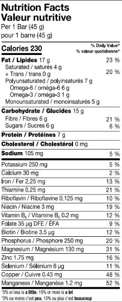 Shelled hemp seeds, Sunflower seeds, Agave Syrup, Almonds, Pumpkin seeds, Toasted coconut, Semisweet Chocolate (sugar, chocolate liquor, cocoa butter, sunflower lecithin, vanilla extract), Flaxseeds, Crisp Brown Rice, Glycerin, Sunflower Oil Blend (Sunflower Oil, Tocopherols to maintain freshness, Rosemary Extract), Cocoa Powder, Sea Salt, Cashews, Fancy Molasses, Cocoa Butter, Agar-Agar.