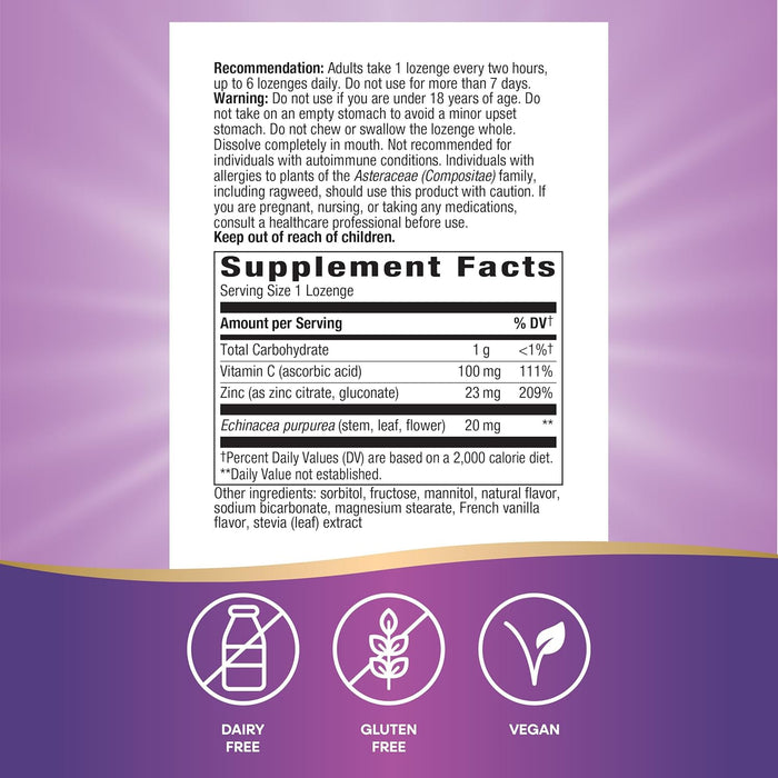 - Convenient lozenges are formulated with high potency zinc and vitamin C, with Echinacea.