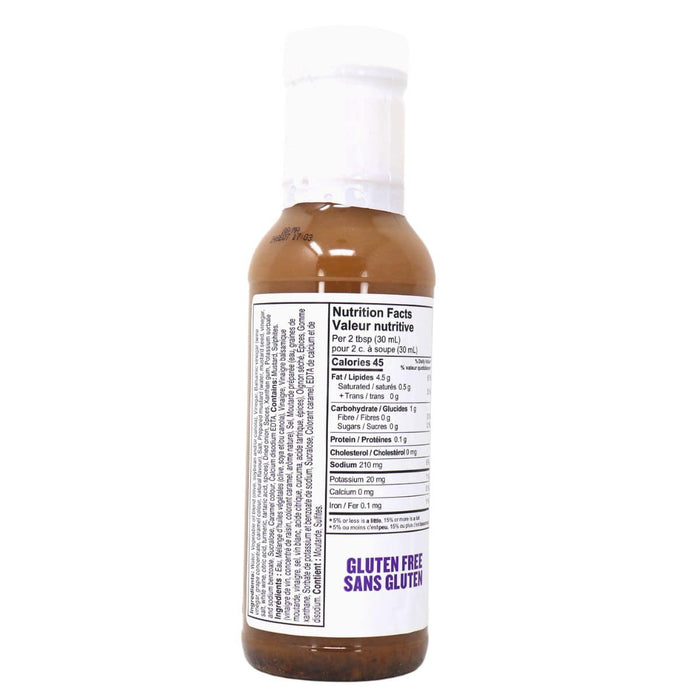 Water, Vegetable Oil Blend (Olive, Soybean And/Or Canola), Vinegar, Balsamic Vinegar (Wine Vinegar, Grape Concentrate, Caramel Colour, Natural Flavour), Salt, Prepared Mustard (Water, Mustard Seed, Vinegar, Salt, White Wine, Citric Acid, Turmeric, Tartaric Acid, Spices), Dried Onion, Spices, Xanthan Gum, Potassium Sorbate and Sodium Benzoate (Preservatives), Sucralose, Caramel Color, Calcium Disodium EDTA (To Preserve Flavour).